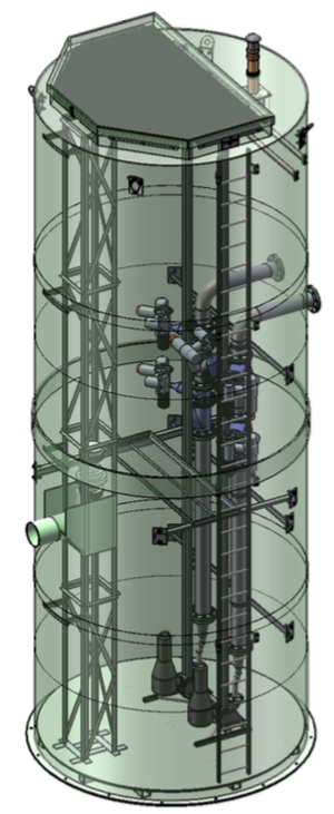 Насосная станция – цилиндрической или 8-образной формы резервуар, внутрь которого помещены насосы, трубопроводная обвязка и запорно-регулирующая арматура. Станции могут быть оснащены различным оборудованием. Например: различные датчики, автоматические системы управления, система механической очистки и измельчитель, взмучивание осадка и т.д.