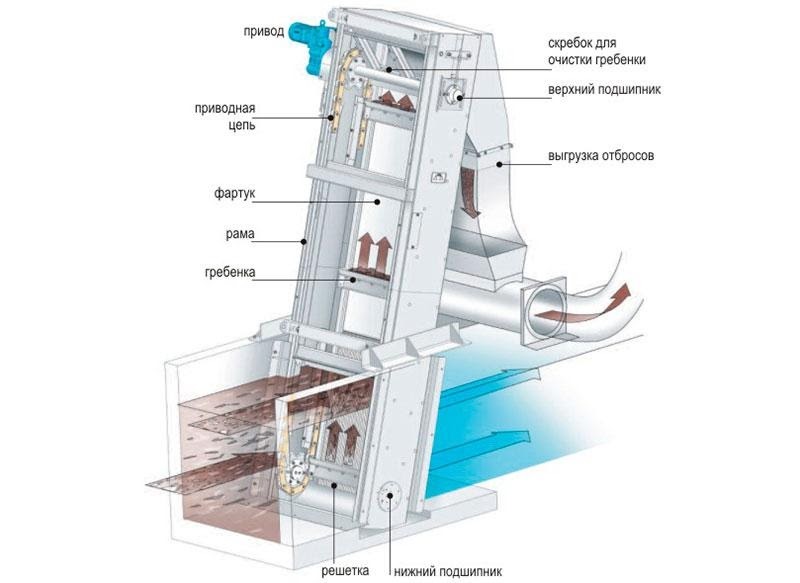Данный тип решеток может устанавливаться в канал с большим расходом воды. Грабельная решетка помещается в канал, по которому движутся сточные воды. Вода очищается за счет сборного ламельного полотна, и прохождение через фильтрующий прозор. Вертикальный набор ламелей очищается с помощью граблины снизу в верх, проводящиеся в движение за счет цепной передачи от вала мотор-редуктора. Количество граблин варьируется, и выбирается по расчету производительности и высоты канала.
