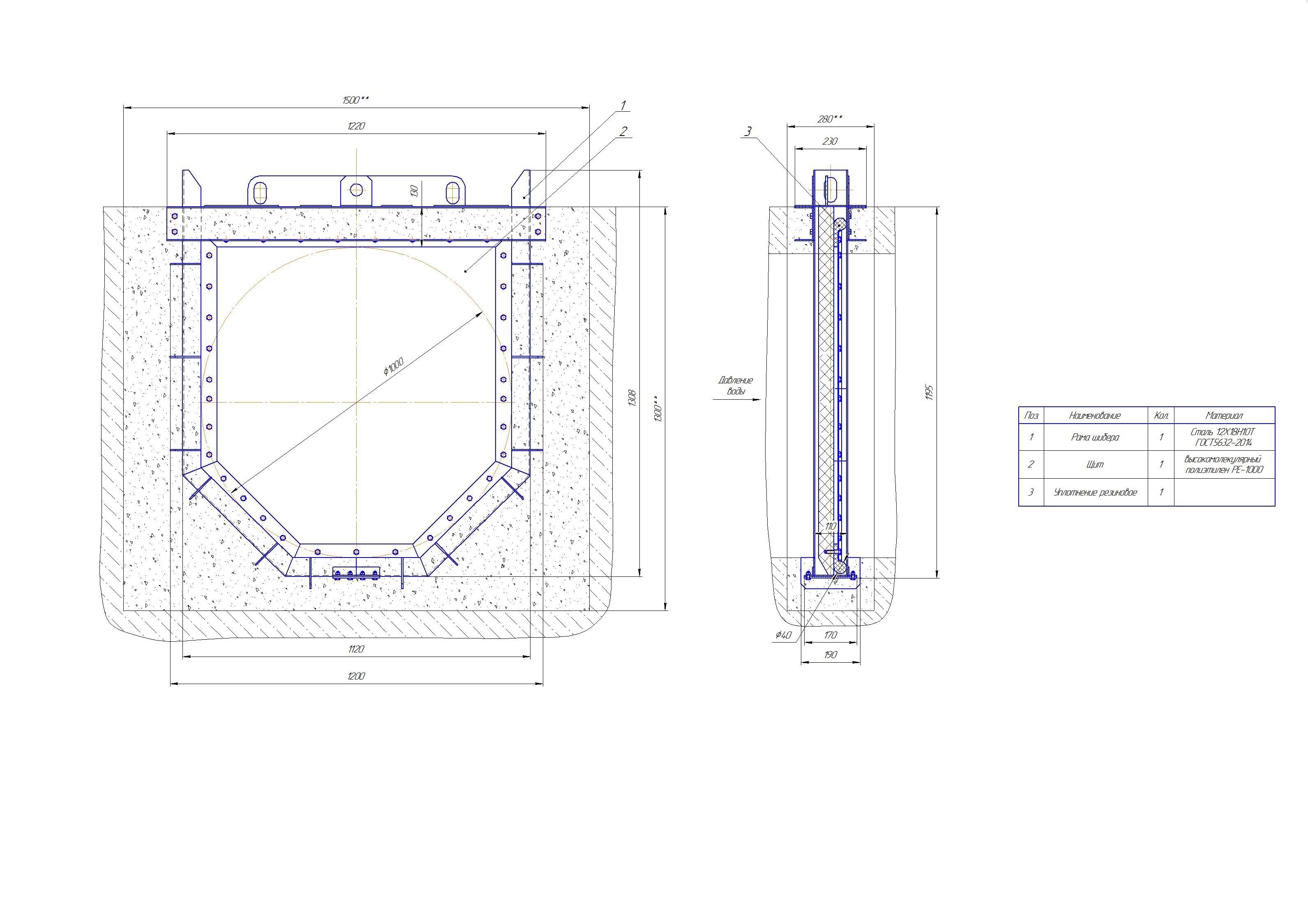Конструкция и габаритные размеры составных частей затвора из нержавеющей стали должны обеспечивать возможность их демонтажа и подъема на поверхность через проем канализационного люка диаметром 600 мм.;